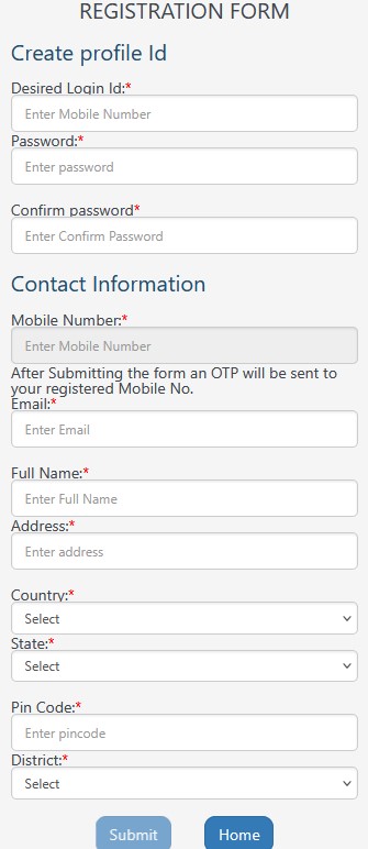 Enter Email id in below form, Fill profile name, details of Address like Street name, Door no, Village or Town Name and PIN code. Choose district from List and select Submit button.